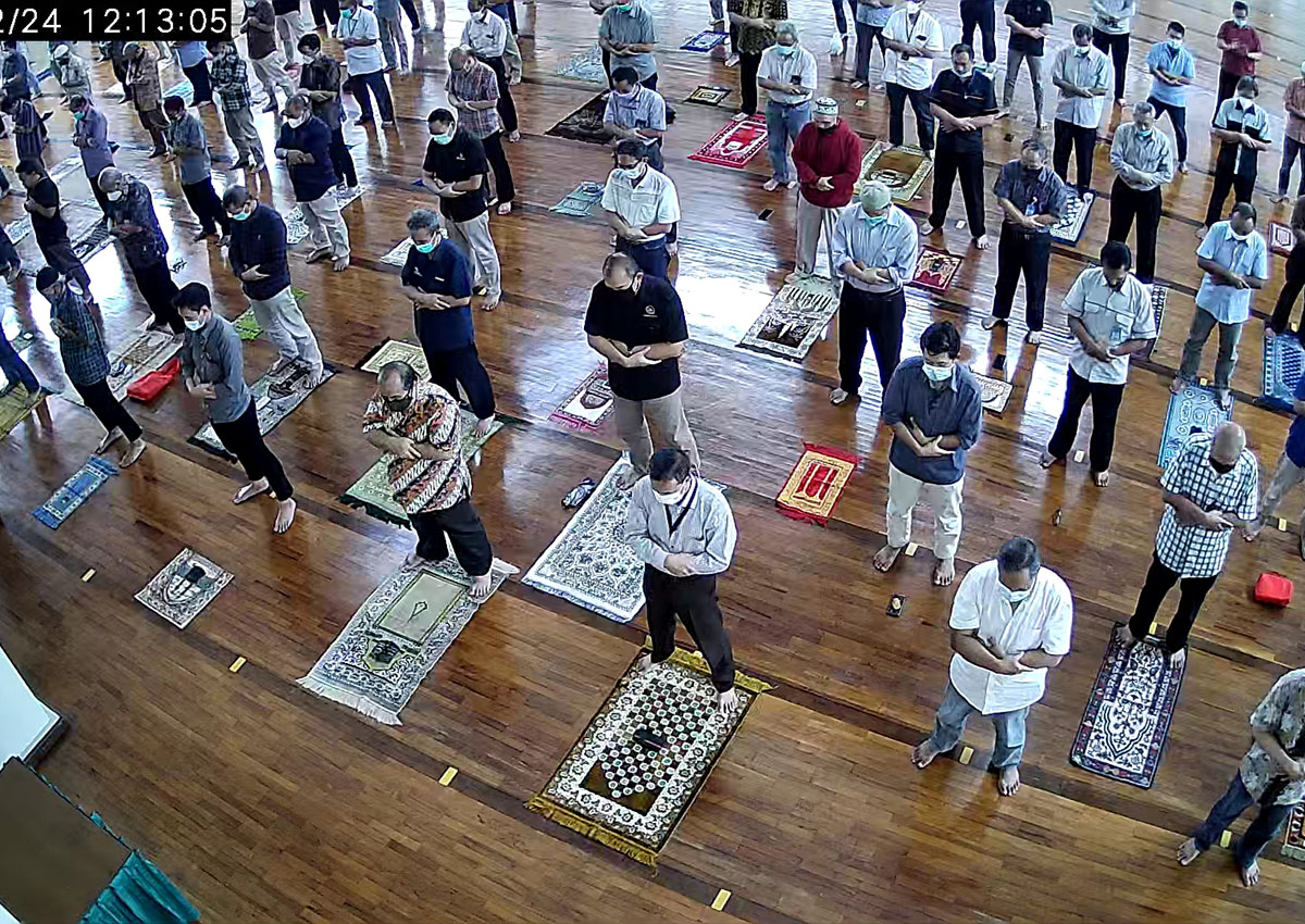 Pelaksanaan Sholat Dzuhur di Masjid Raya Habiburrahman PT. Dirgantara Indonesia (Persero), pada hari Rabu tanggal 24 Februari 2021. Foto diambil dari salah satu Kamera CCTV yang ada di Masjid Raya Habiburrahman. Ada beberapa titik yang dipasang Kamera CCTV di Masjid Raya Habiburrahman, kamera ini bisa dipantau langsung secara Daring (Online) dari Perangkat Smartphone / Hand Phone yang berbasis Android atau IOS. Tujuan pemasangan Kamera CCTV ini adalah untuk mencegah terjadinya pencurian di wilayah Masjid Raya Habiburrahman dan juga untuk melakukan perekaman (recording) yang bisa dilihat dengan jelas wajah org dengan Kamera CCTV ini.